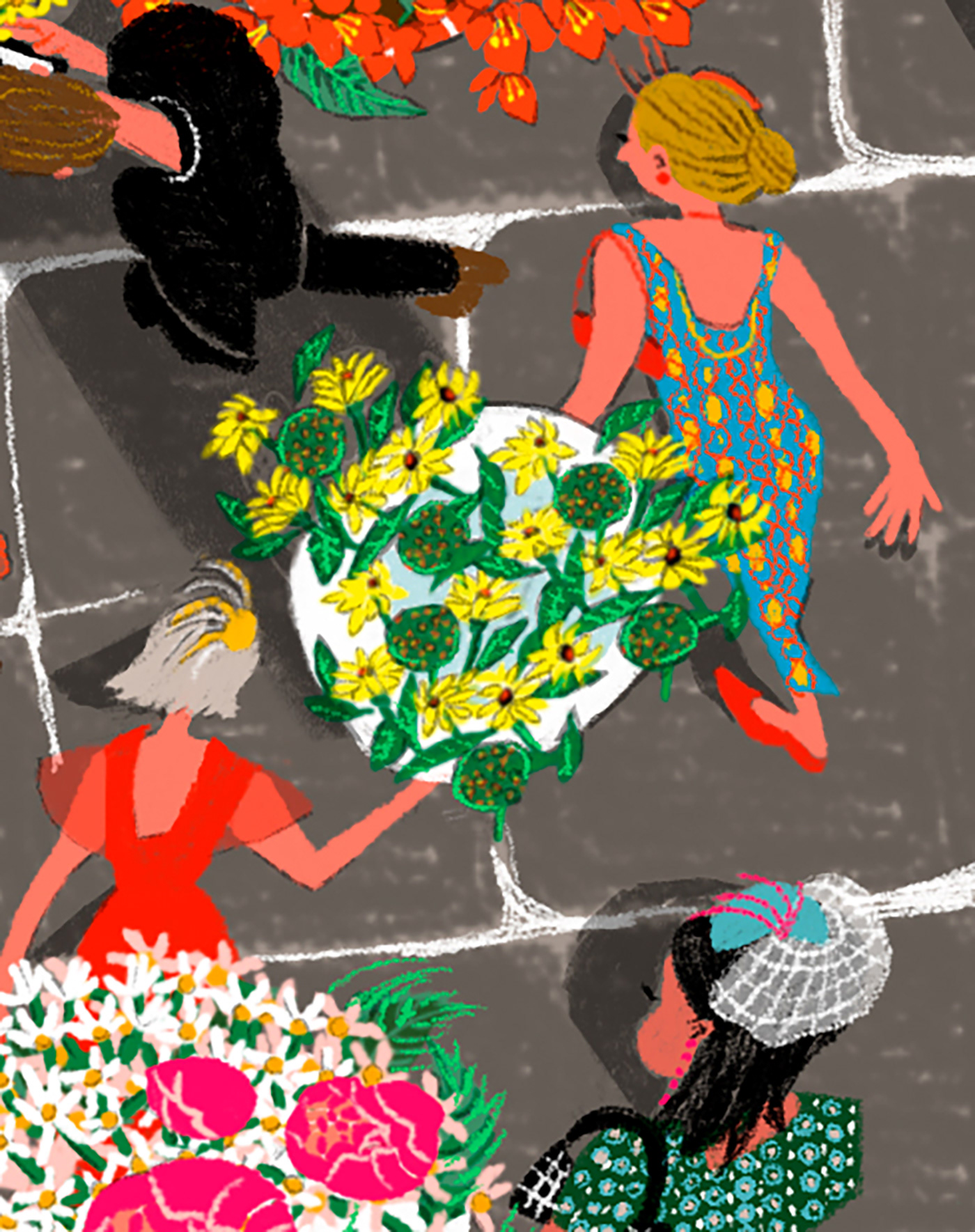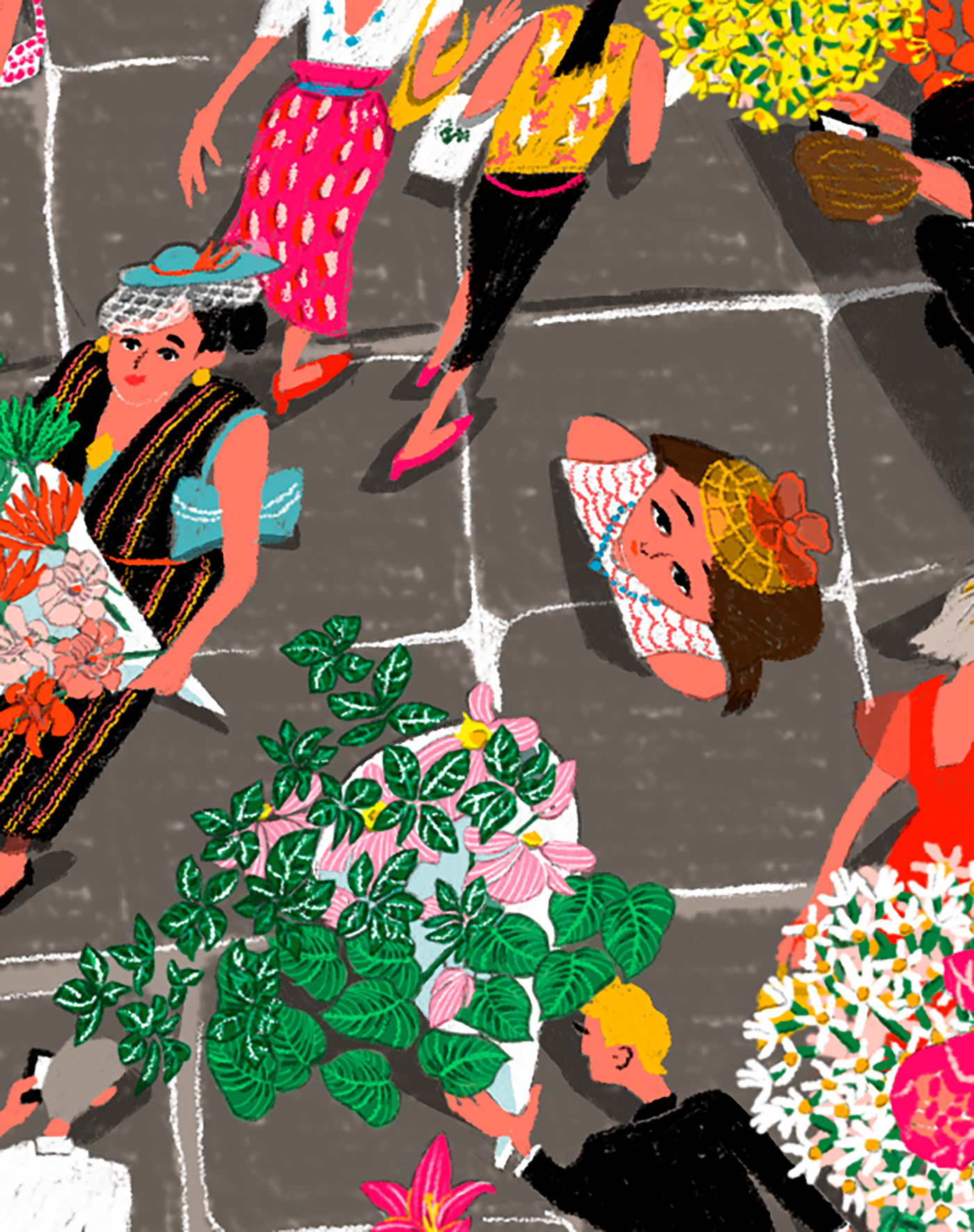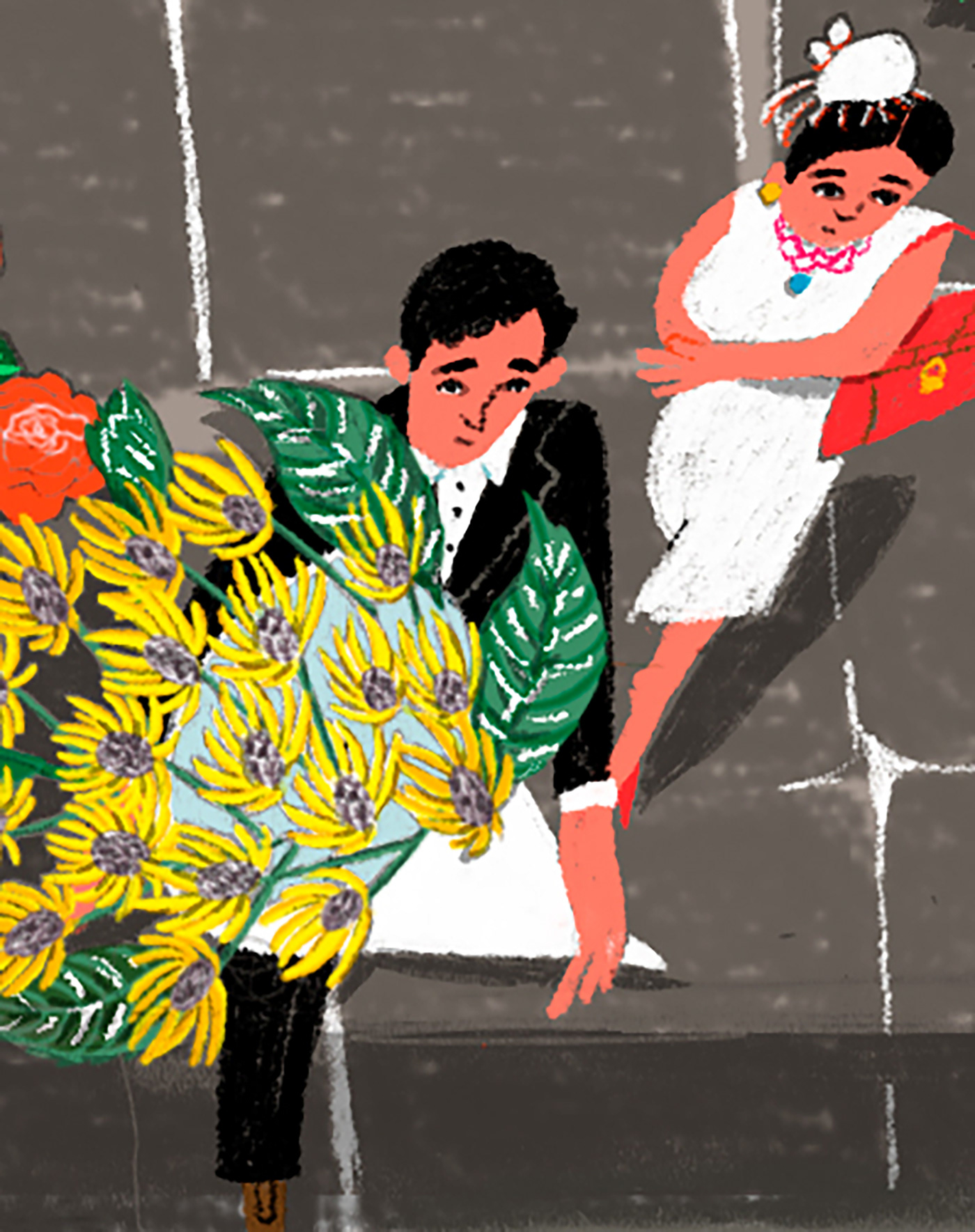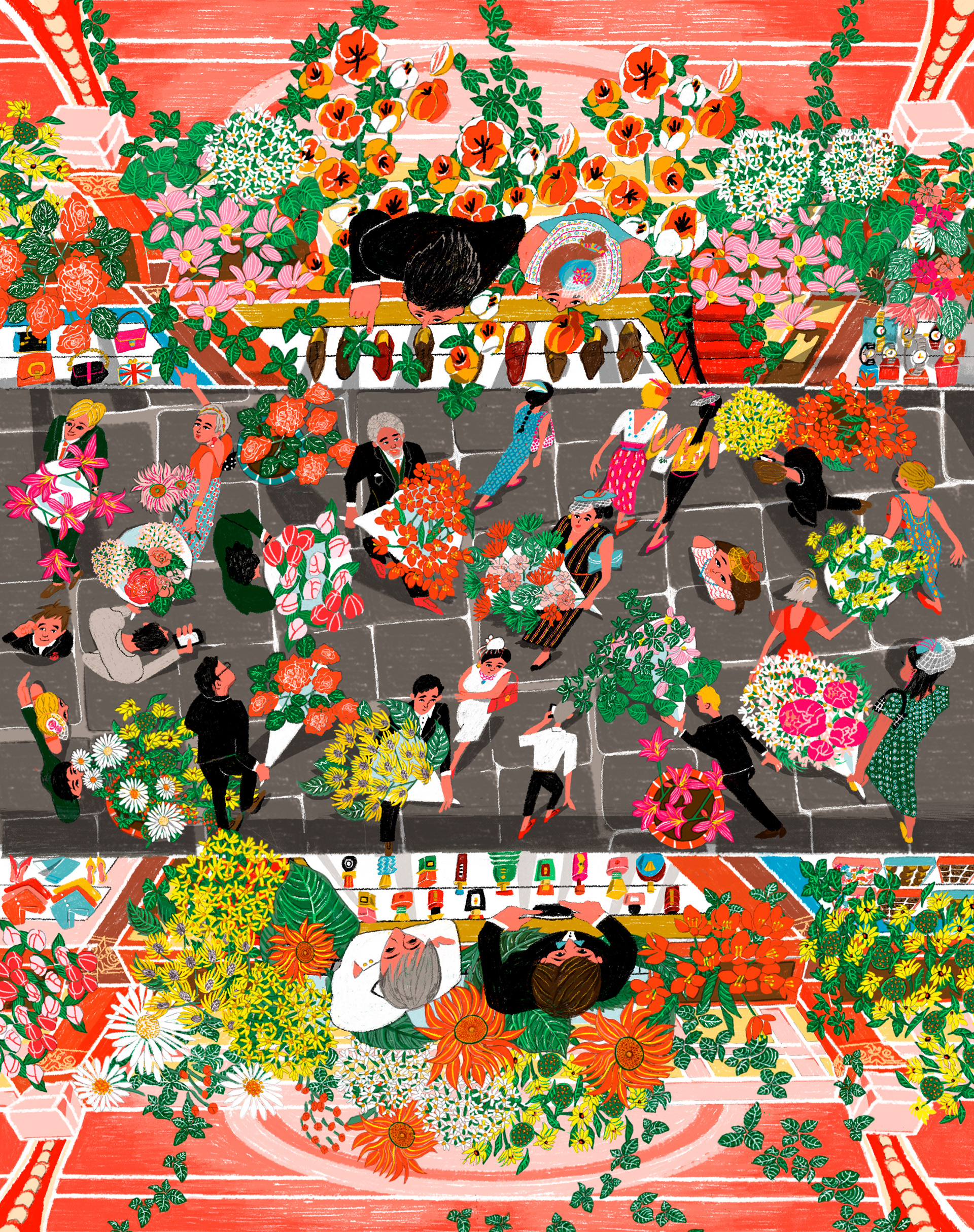 I illustrated the Royal Arcade in London. People are dressed up and carrying bouquets of flowers decorating the streets.