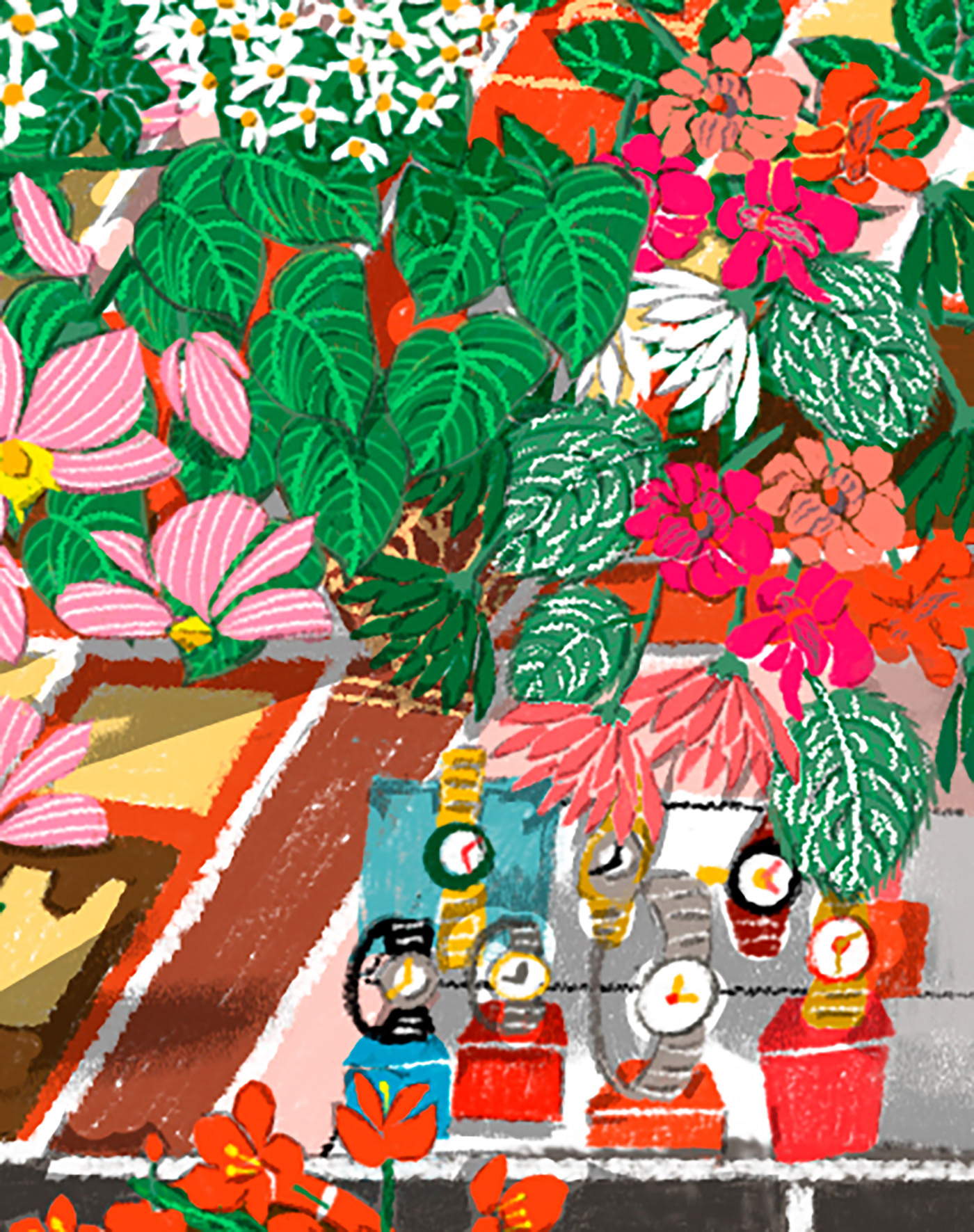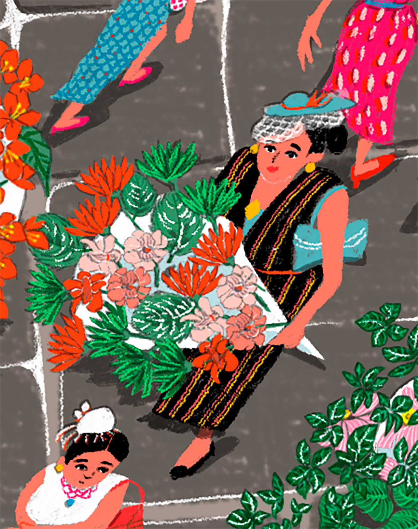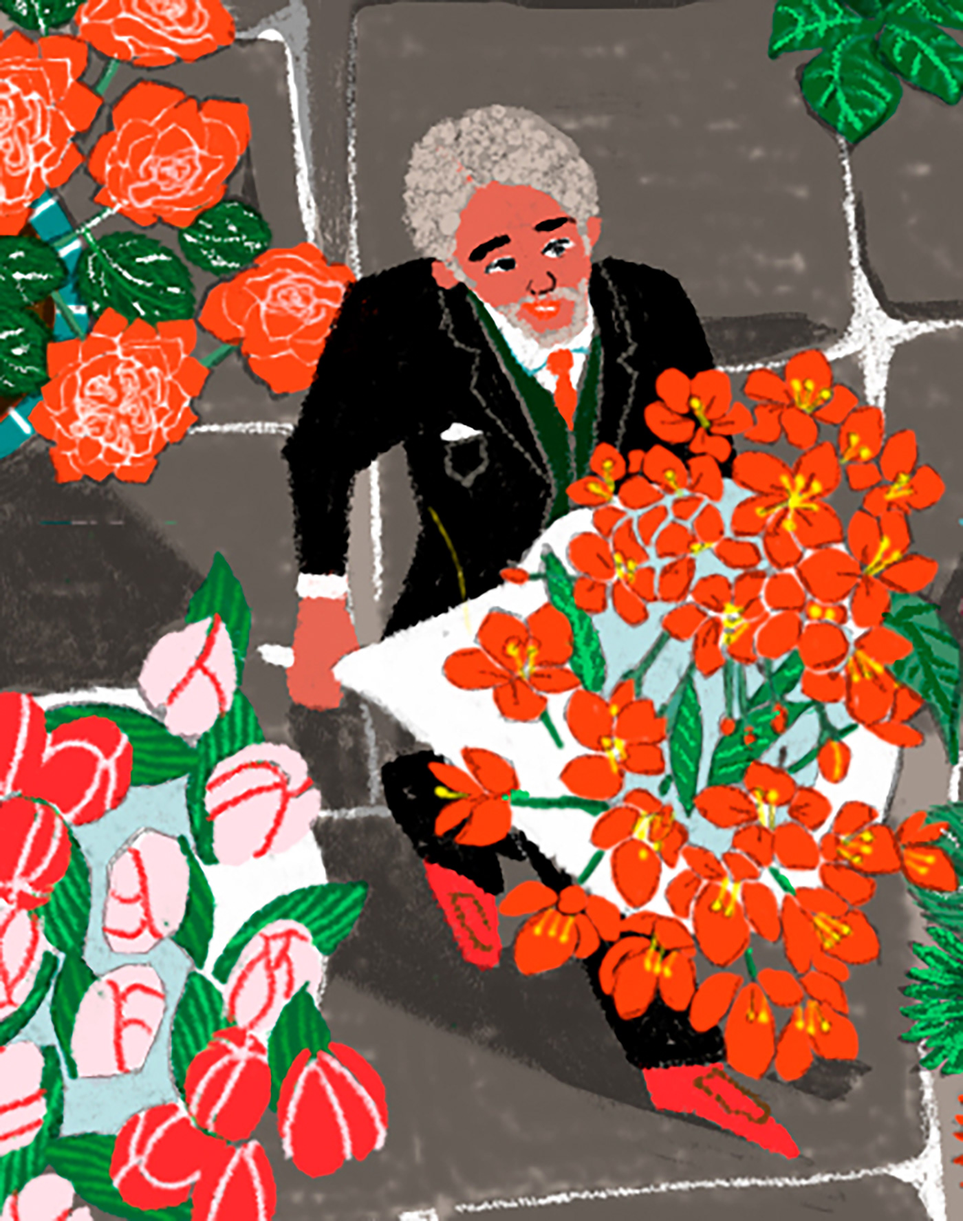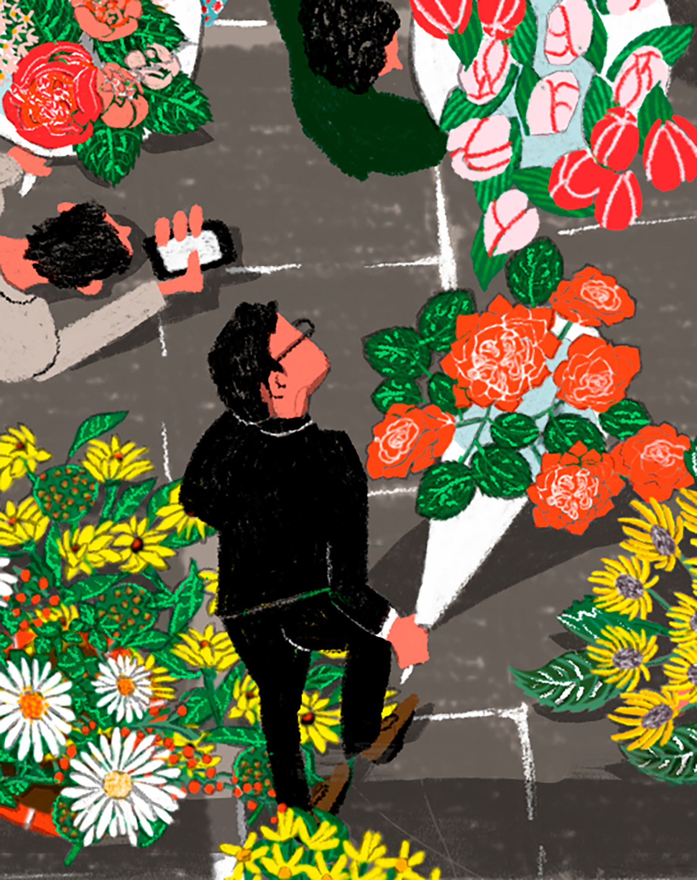 I illustrated the Royal Arcade in London. People are dressed up and carrying bouquets of flowers decorating the streets.