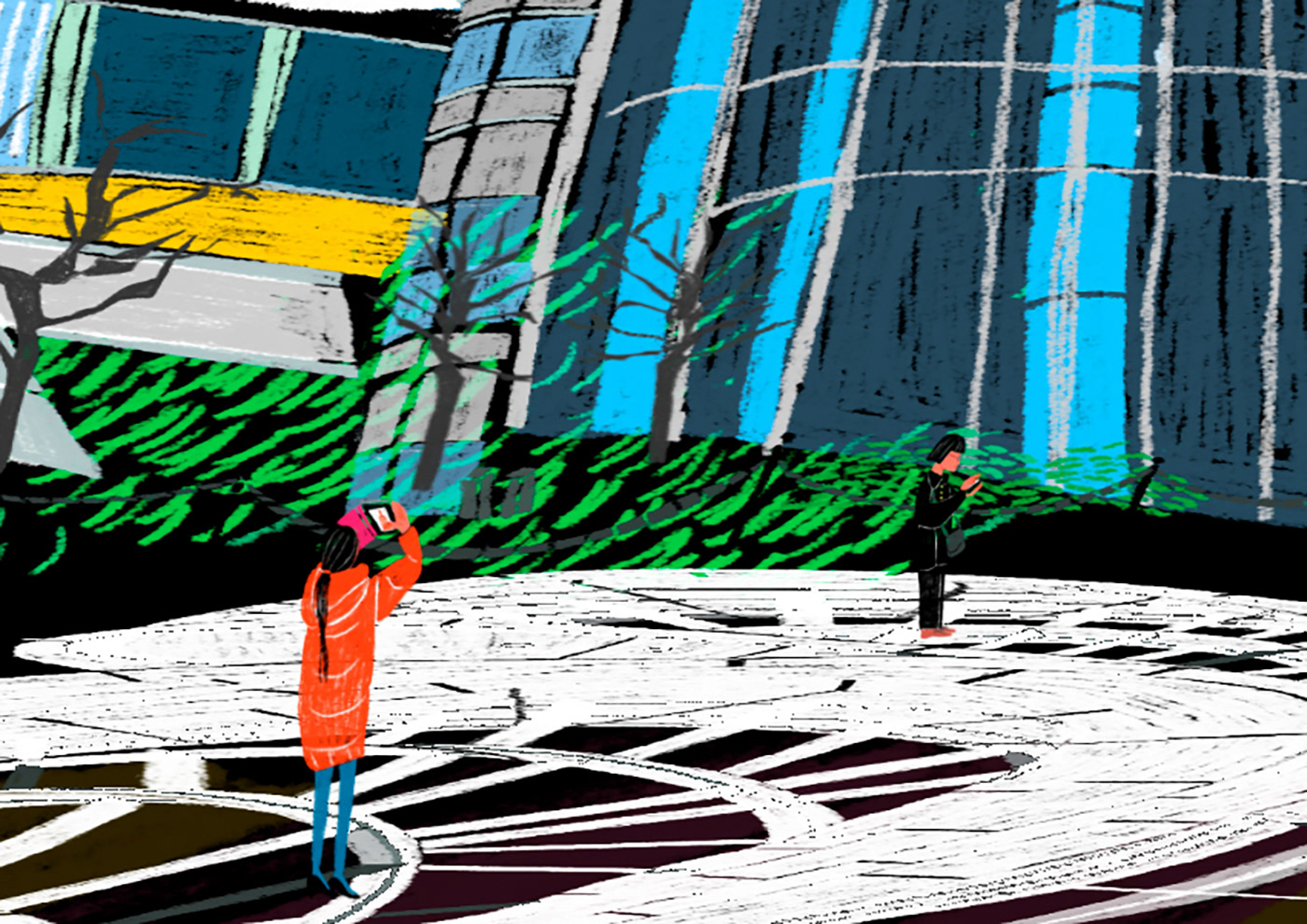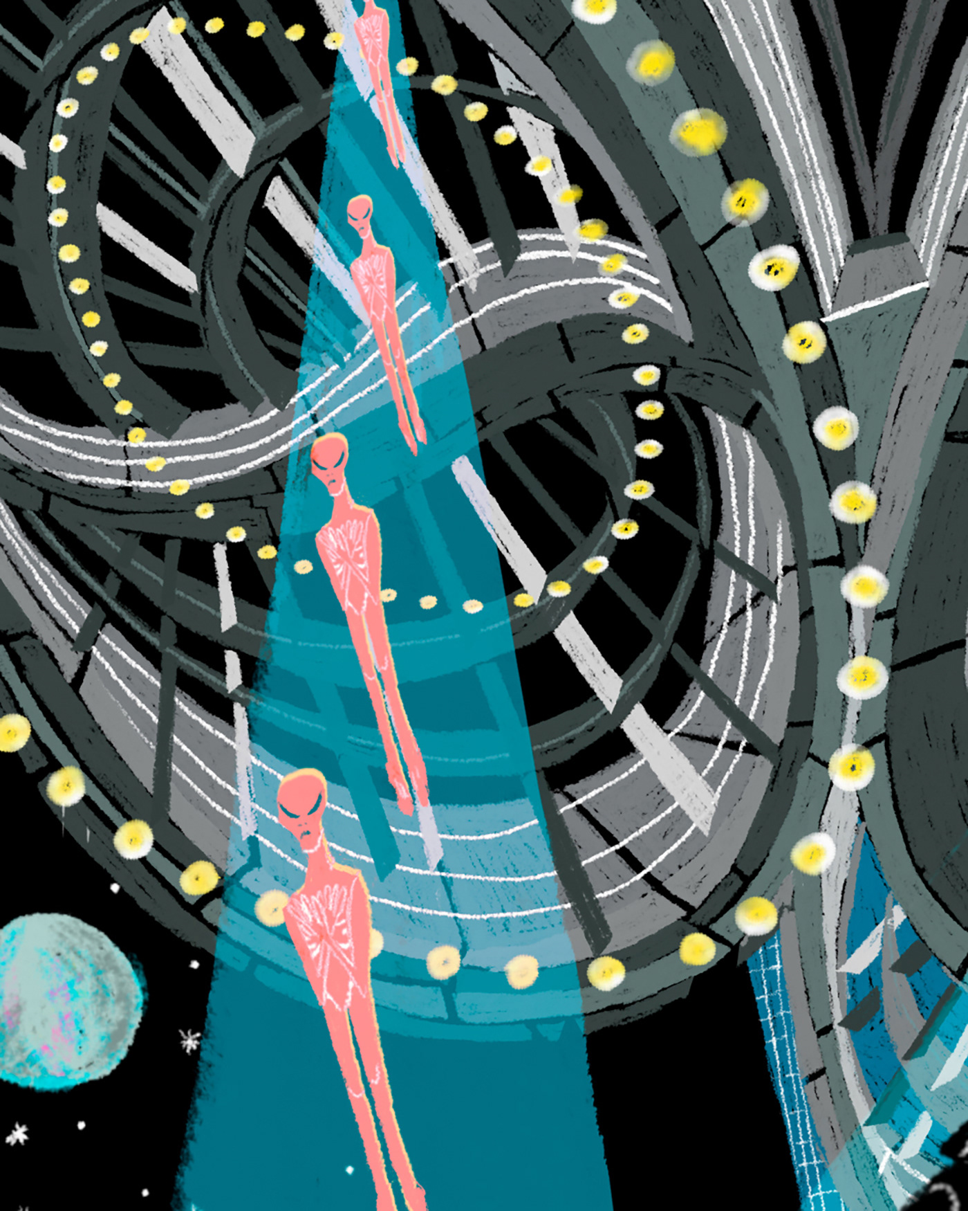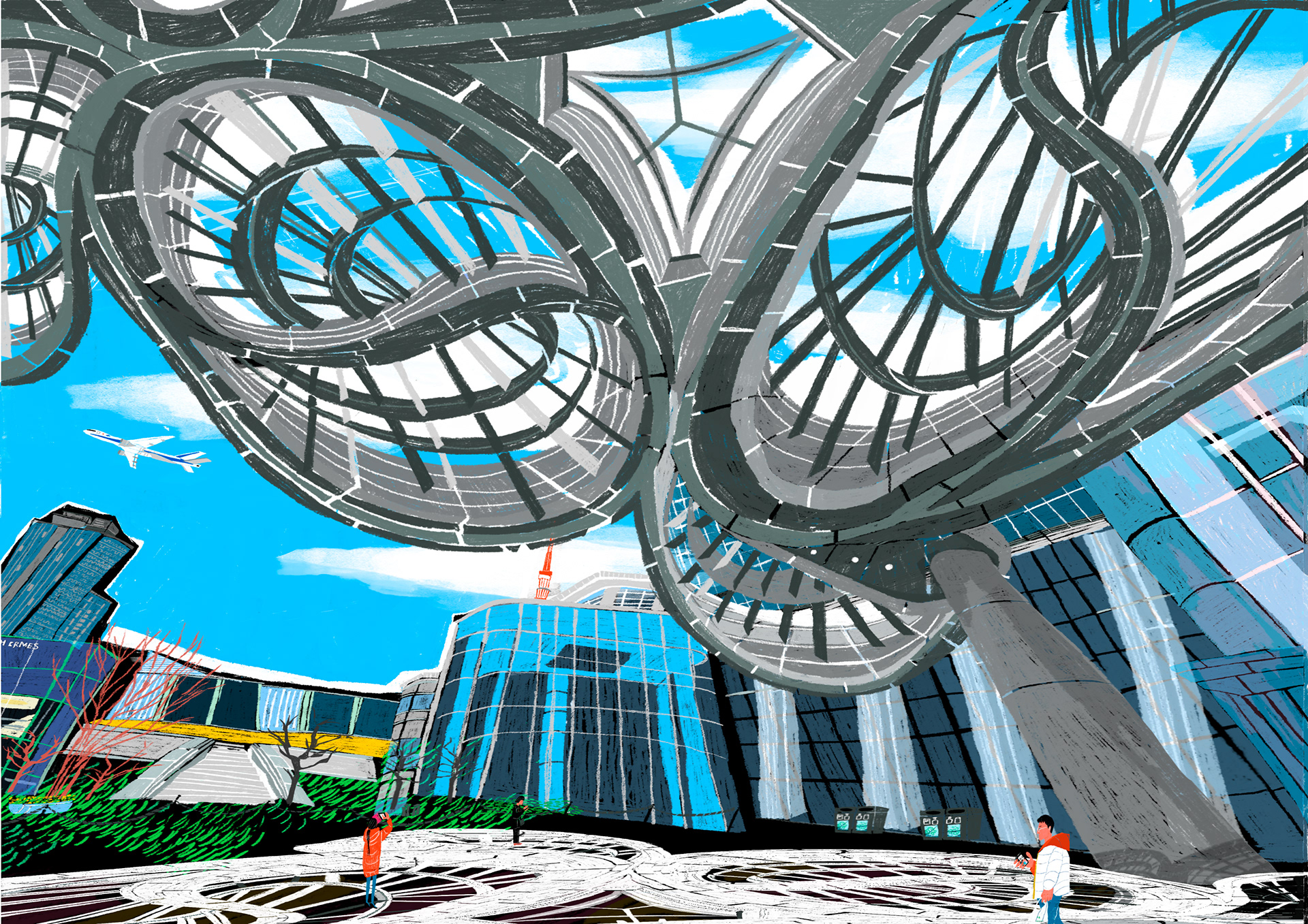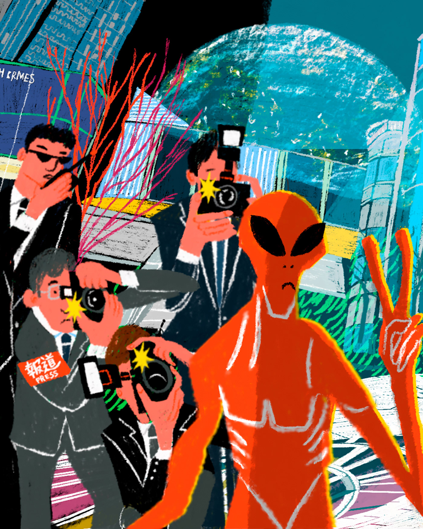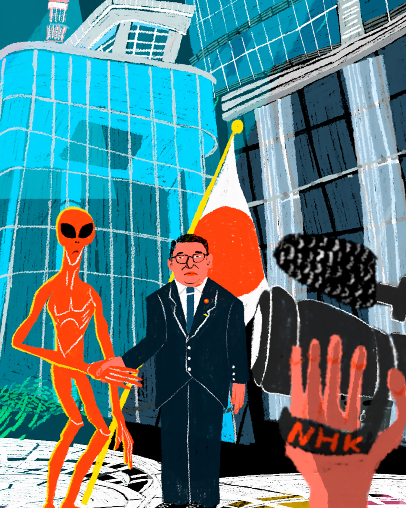 I illustrated scenes of the Japanese Prime Minister meeting an alien at Azabudai Hills, inspired by its architecture, which reminded me of a space fleet.