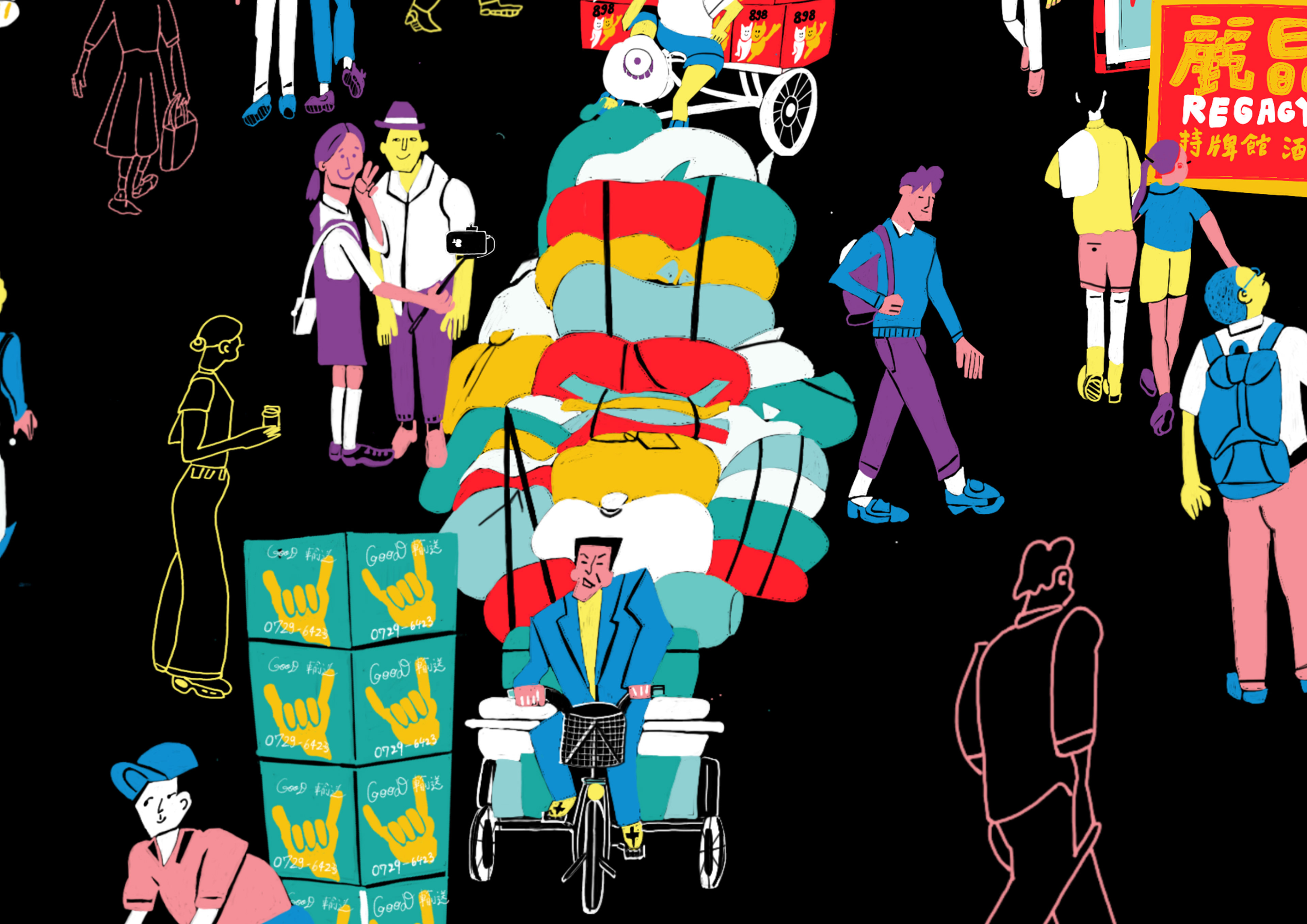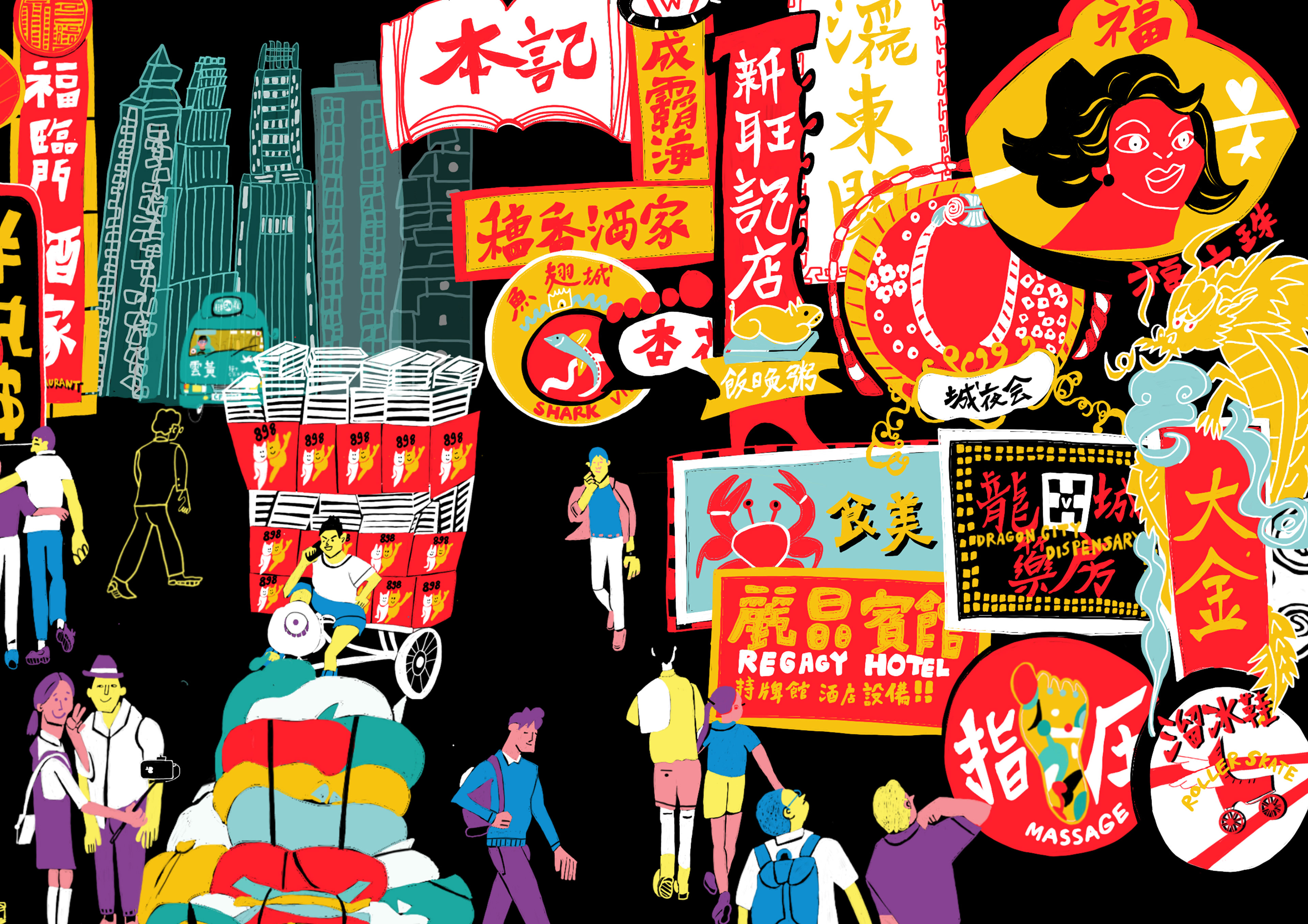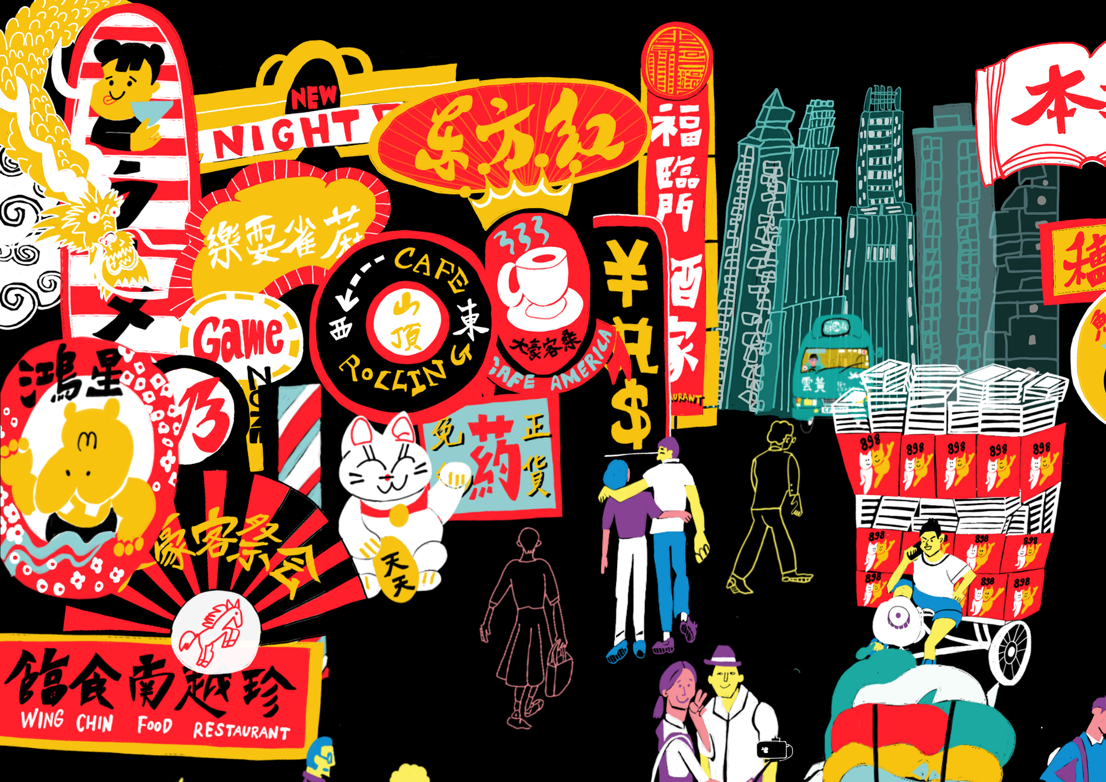 I illustrated a view of the neon lights that I saw when I was traveling.