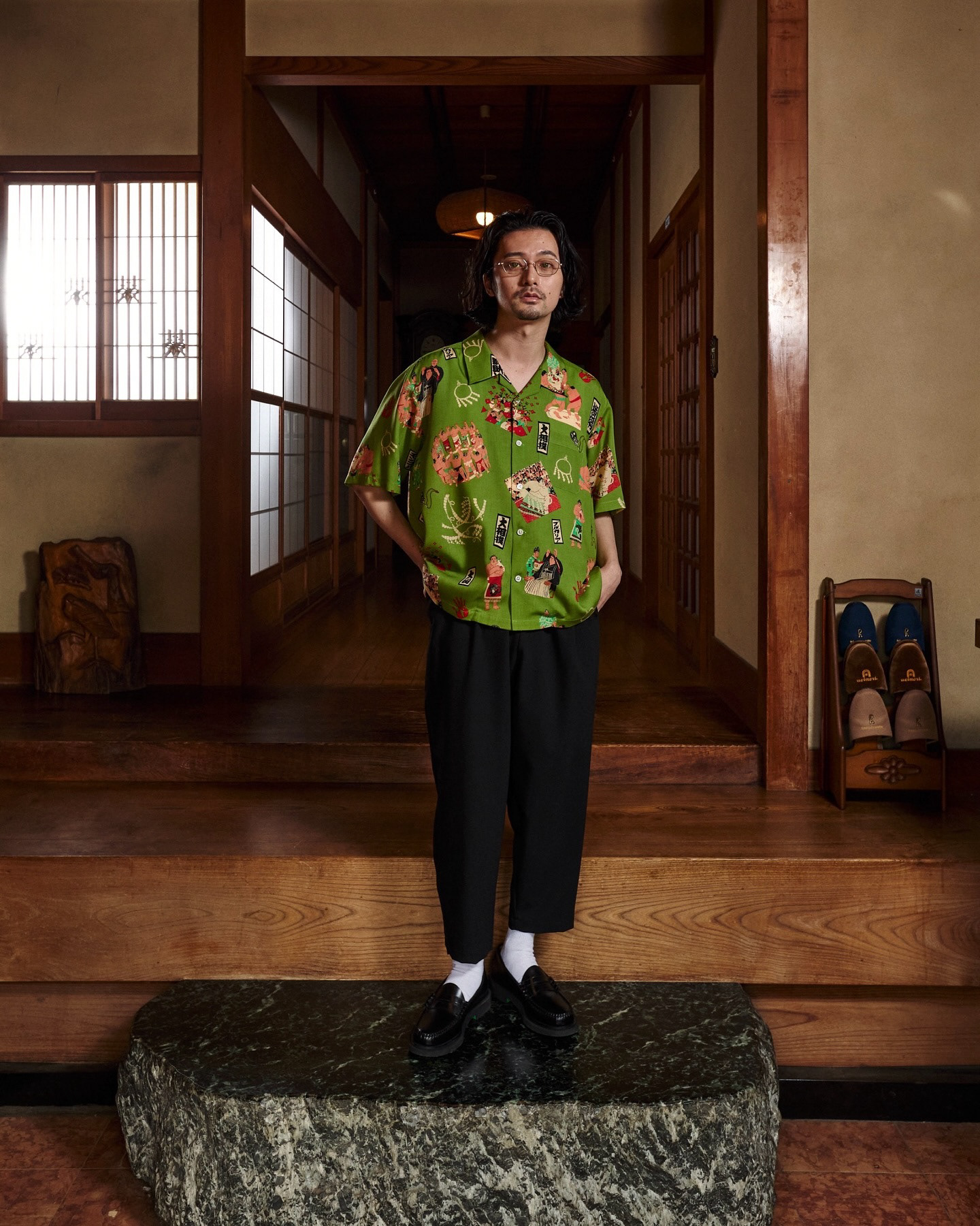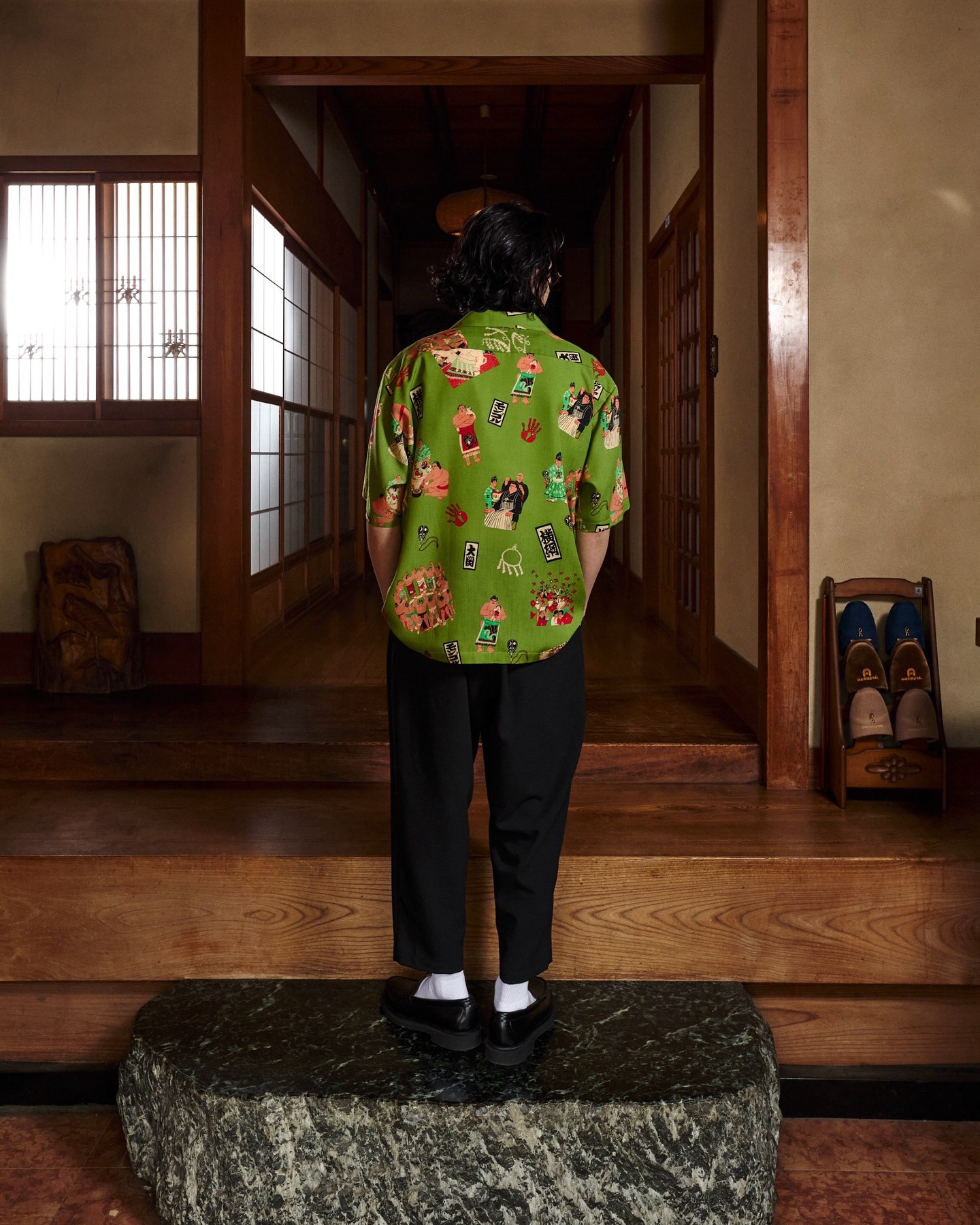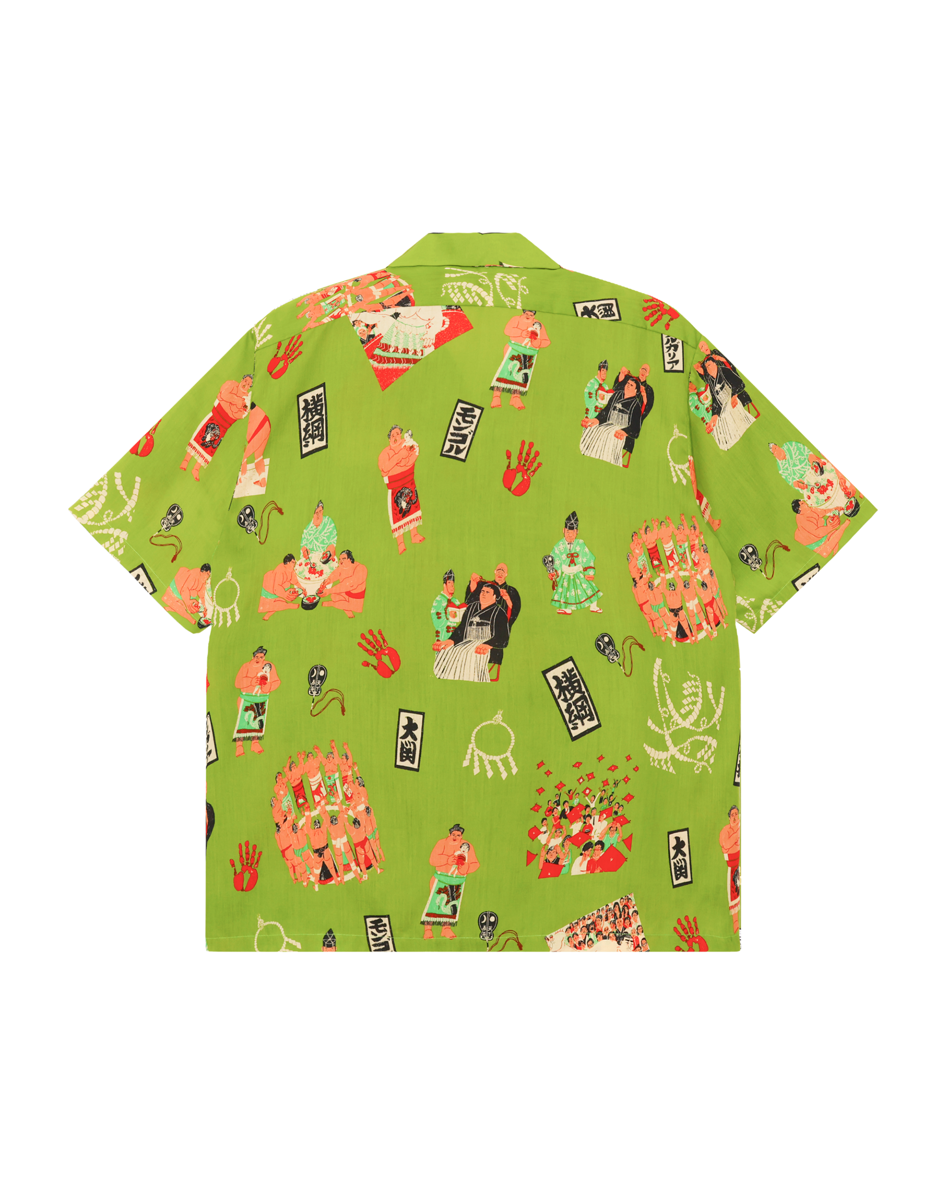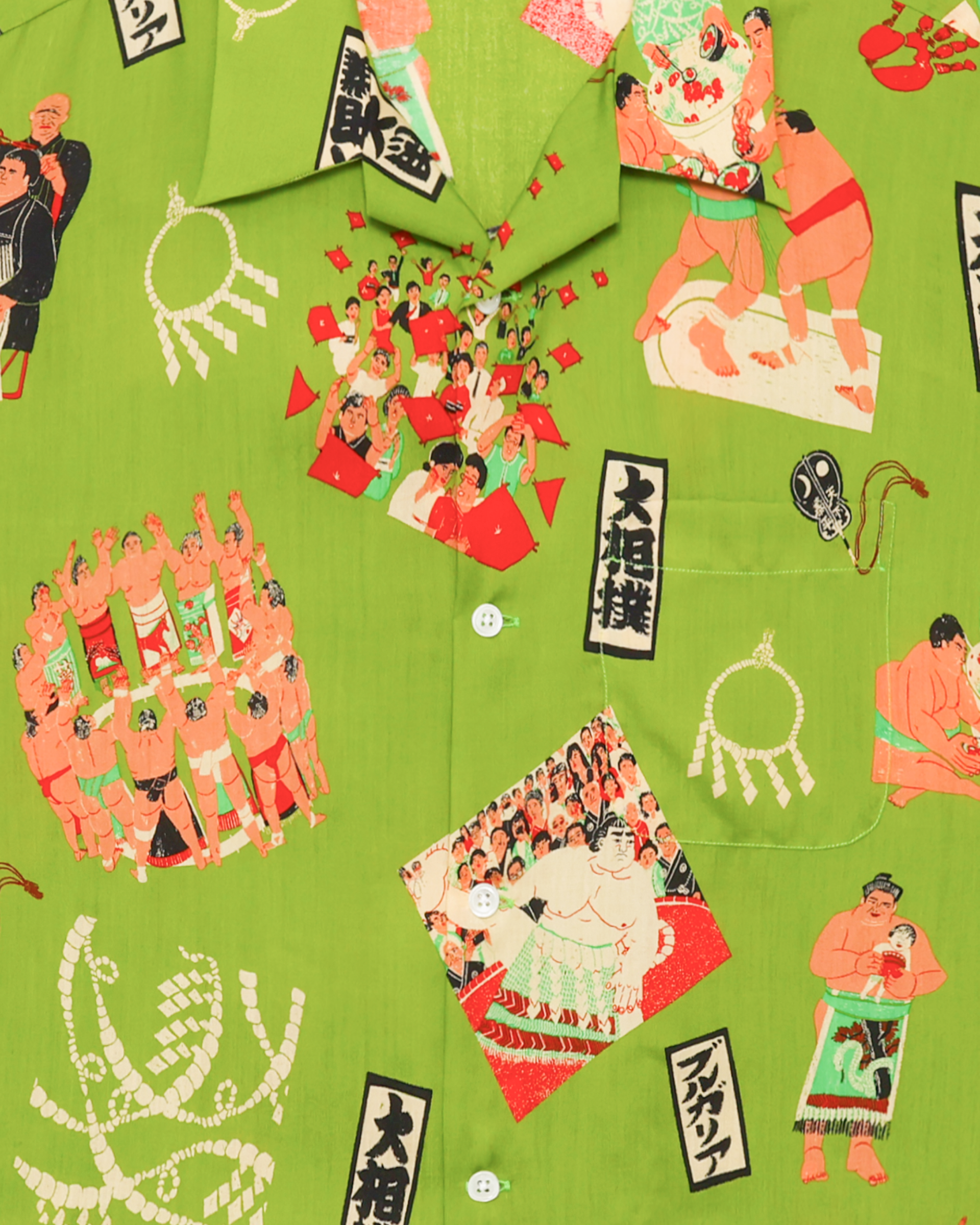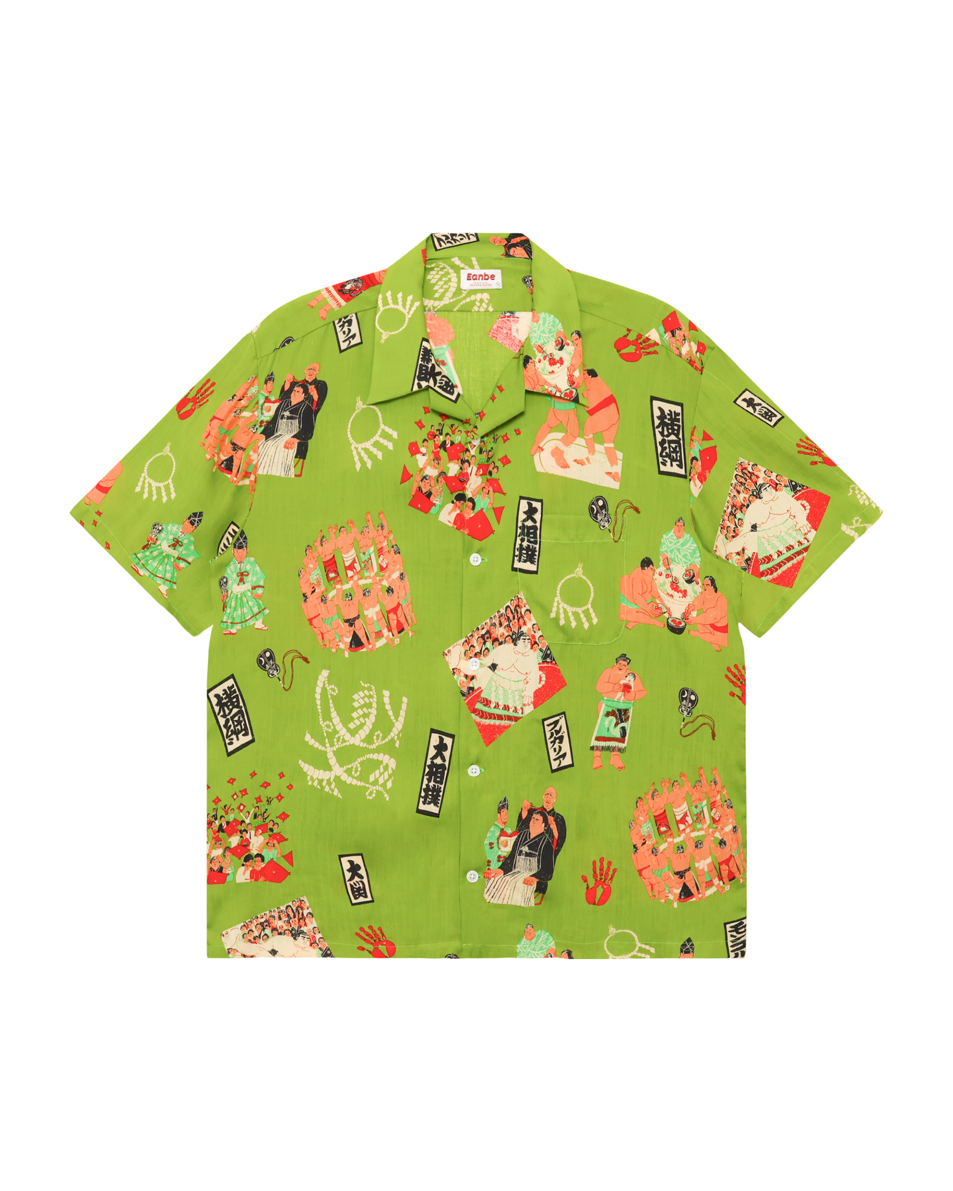 ファッションブランドEanbeのアロハシャツに力士の様々なシーンを描きました。